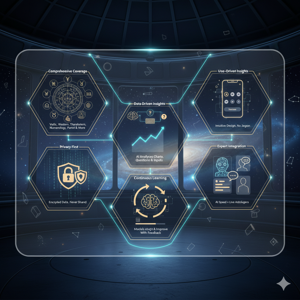 Comprehensive Coverage: We integrate Vedic, Western, Tharabalem, numerology, palmistry, tarot, and more—so users access every astrology method from one app.